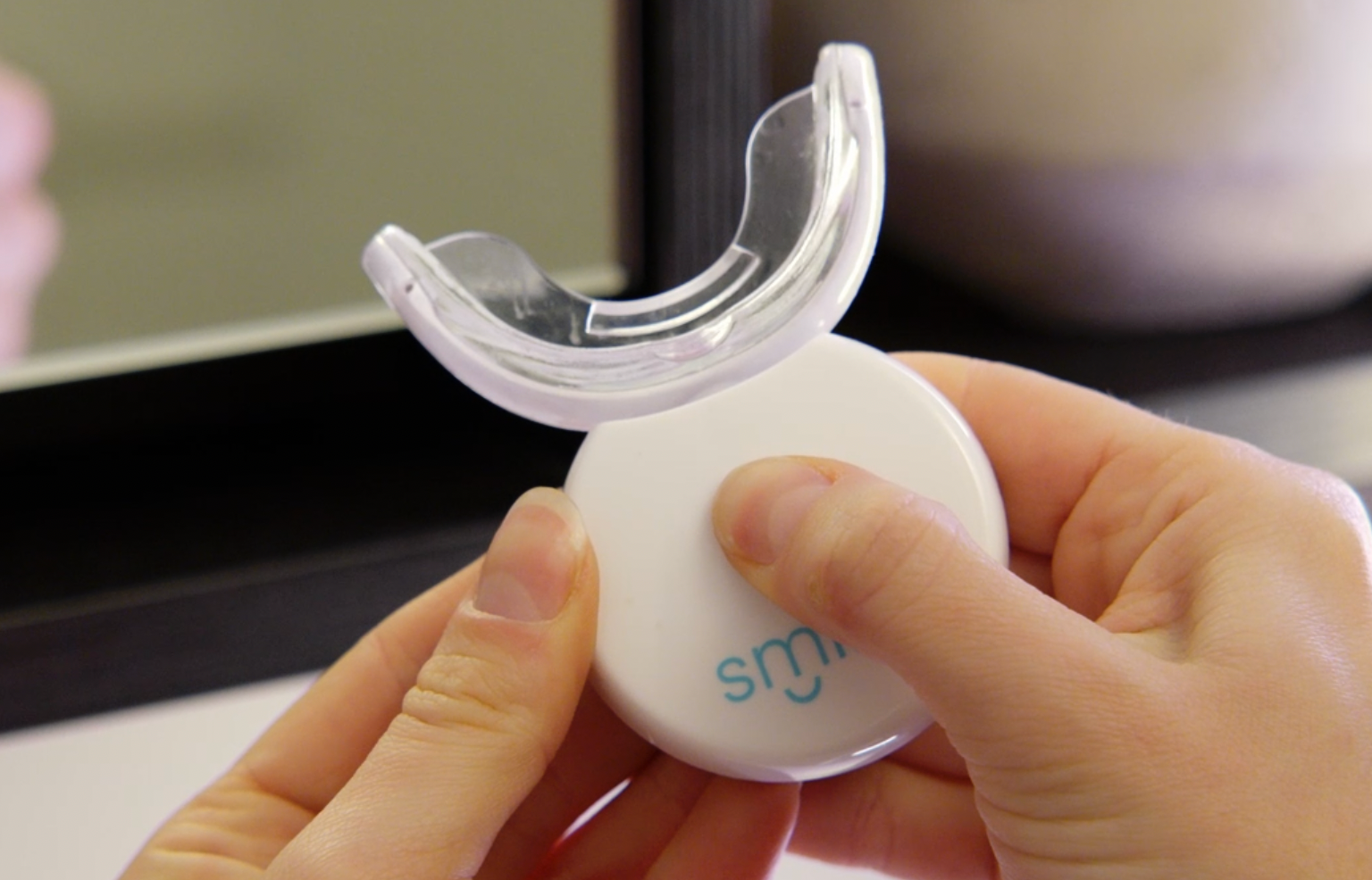 Remove the device from the tray and power on the LED device by pressing the button until the light turns on. Place the device in your mouth (you may need to bite down to hold in place).