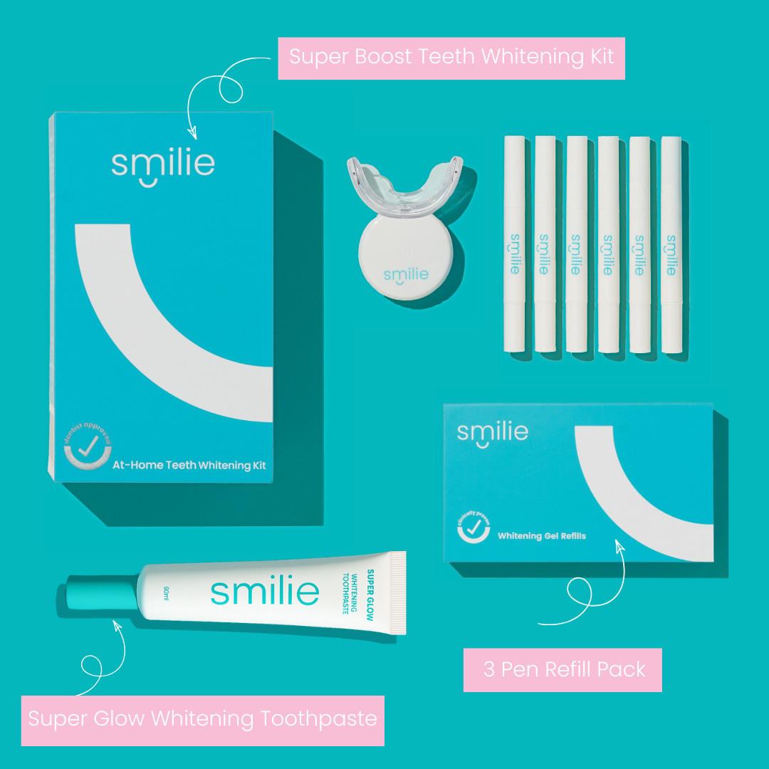 Smilie's Ultra White Brightening Whitening Bundle gives you everything you need for a consistently brighter smile - from your first treatment to your last. With enough product for months of whitening, plus our best-selling toothpaste to maintain your results every day.